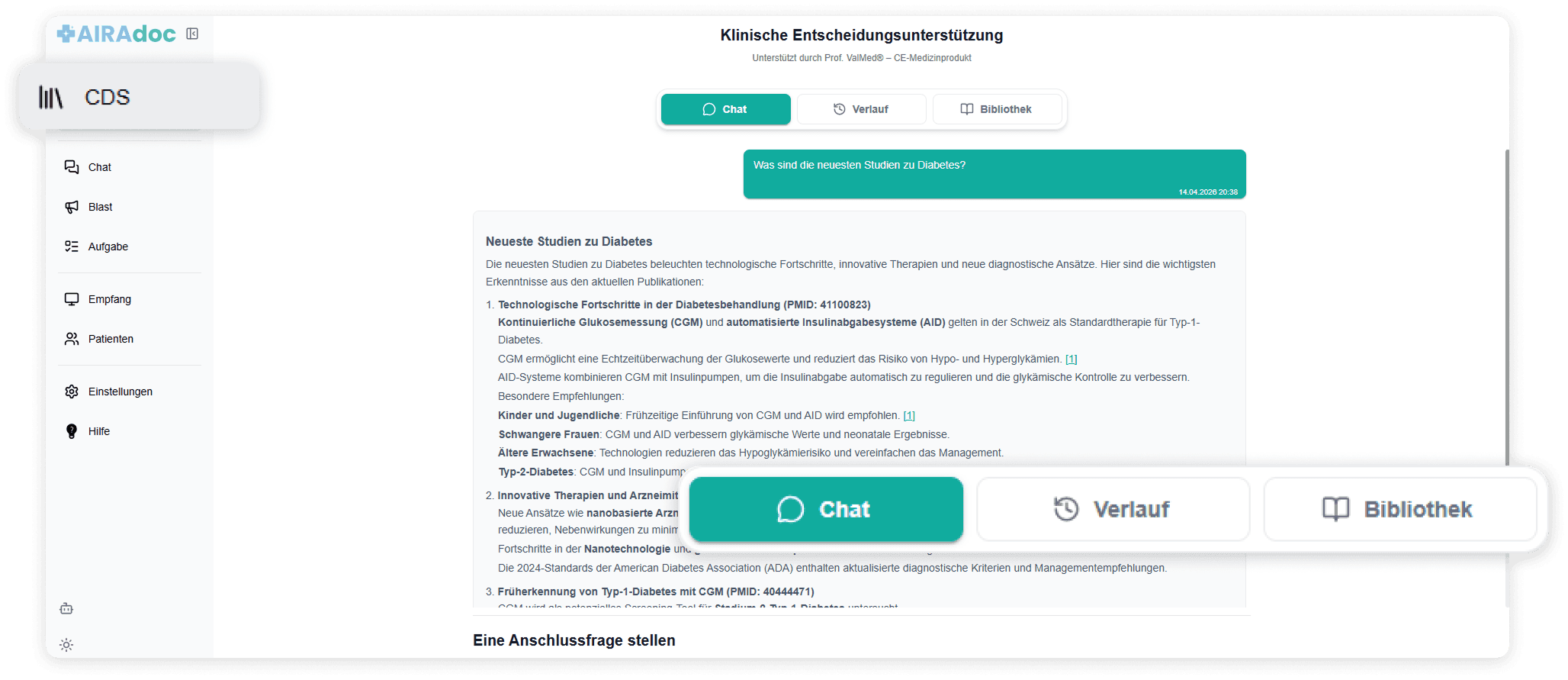 „Erhalten Sie klinische CE-zertifizierte Echtzeit-Leitlinien – unser System liefert verlässliche und aktuelle wissenschaftliche Erkenntnisse, ohne Ihre Patienteninteraktion zu unterbrechen.“